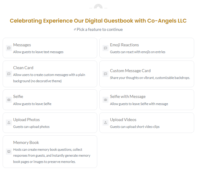 Our Digital Guestbook is designed to make every celebration truly unforgettable. Guests can join instantly using a simple QR code, leaving heartfelt messages, fun selfies, candid photos, or even videos — all preserved in their original quality.